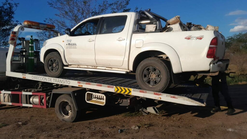 Una camioneta con dos personas a bordo, pertenecientes a una conocida empresa cerealera de nuestra ciudad, fue interceptada por agentes de la Dirección de Tránsito del Municipio, arrojando en la vía pública residuos, cuya presunta toxicidad se desconoce.