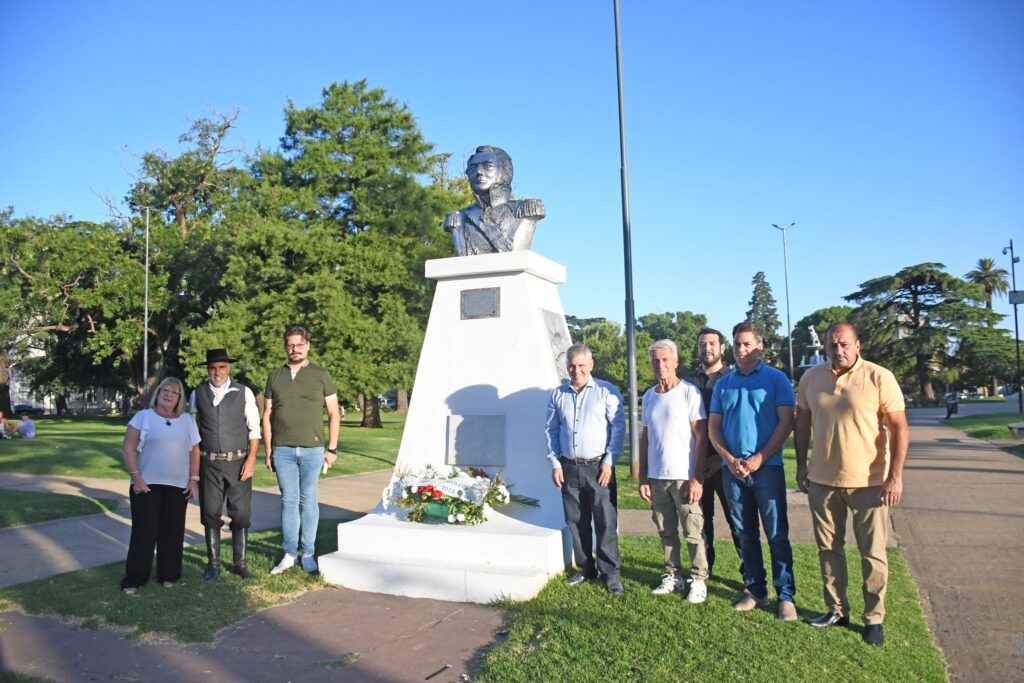 Al pie del busto que recuerda la figura de Rosas -en la plaza central- fue depositada una ofrenda floral.